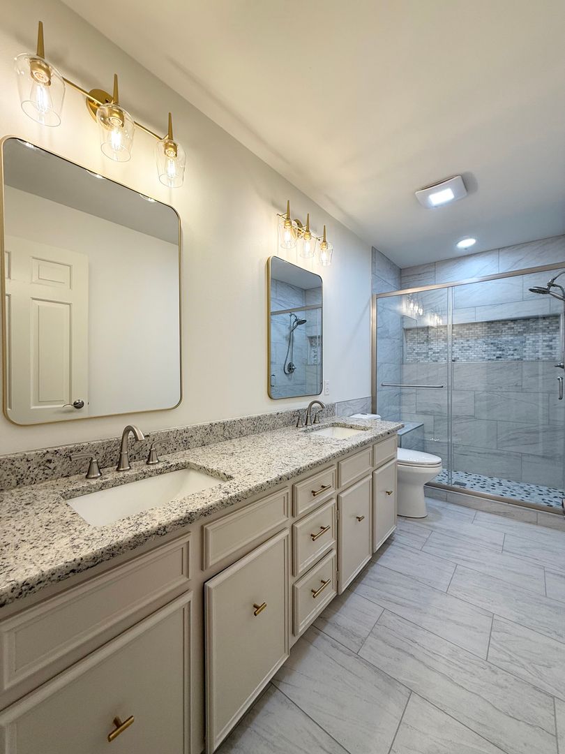 Inside, you’ll find two inviting living areas, a formal living room and a cozy den with a fireplace, plus an updated kitchen featuring solid surface countertops, a double oven, electric cooktop, stainless steel refrigerator and dishwasher, and a large custom sink. A separate wet bar area adds convenience for entertaining, while the dedicated office provides a quiet space for work or study. The bathrooms have been thoughtfully upgraded with custom tile, solid surface countertops, and top of the line toilets. Elegant lighting fixtures, custom blinds, and a spacious laundry room add to the home’s comfort and sophistication.